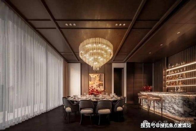 而业主专享的私宴厅则是将“尊贵感”说到了极致!臻选奢石营造雅致屏风,墙上大师匠呈繁花艺作,定制灯具璀璨生辉,摩登意蕴充盈其中,匹配大人物品位。除了敞阔的就餐空间,还独立配置吧台、品茗休息区。暮色四合,华灯初上,谈笑风生中展现风雅从容,觥筹交错间皆是繁华丰茂。