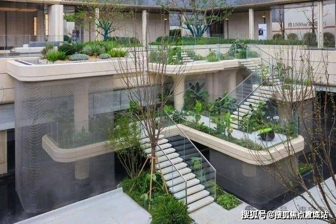 点睛之笔在于4层悬浮式阶梯,设计理念据说来自全球十二大奢华酒店之一的迪拜丽晶公寓,每一个观景露台都种植着不同的植被,一步一景,更重要的是,不同的露台对应着不同的观景视野点,将不同高度的下沉式庭院景观,通过极其优雅的方式传递给了业主。这个归家体验可以说是拉满了!