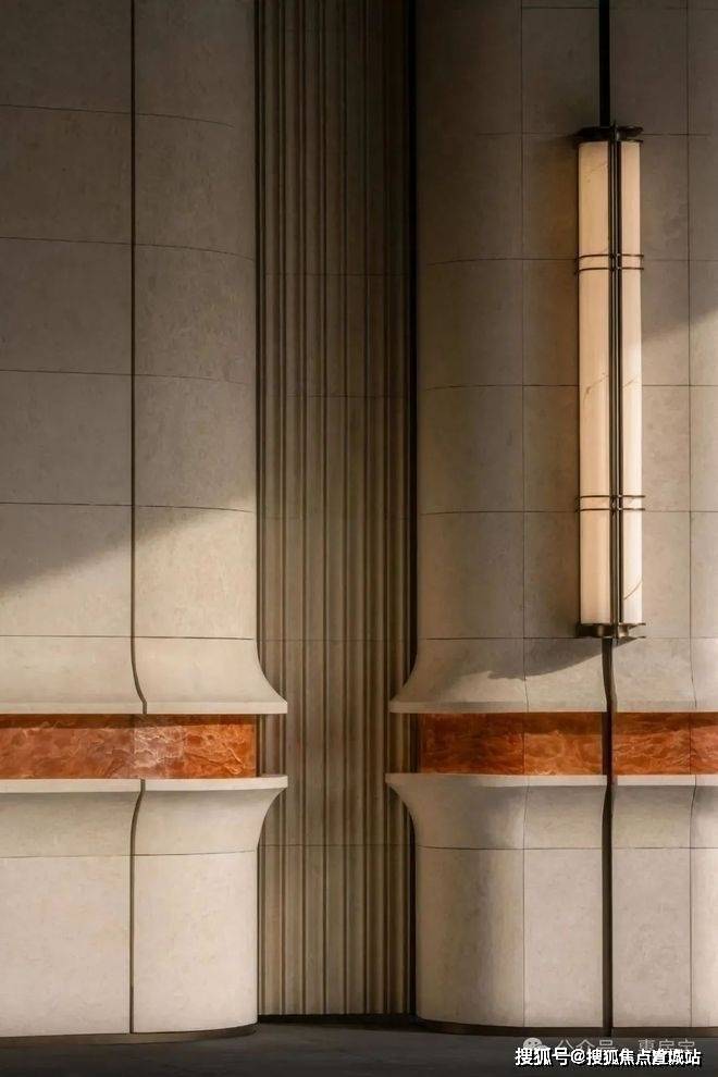 通过迎宾楼,便来到了约20米长的精神游廊,该精神游廊同源招商玺“树宅相守”的设计手法,更致敬建筑诗人斯卡帕“以自然光感去创造时间驻留感”的理念,通过对光线、材质与空间的创新打造,营造充满宁静的归家场域。