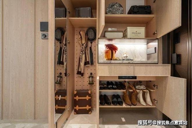 玄关收纳更精细,每个格子的规划都很贴近生活,随手物件,女主人的高靴,吸尘器、扫地机器人、行李箱等都有各自安置空间。