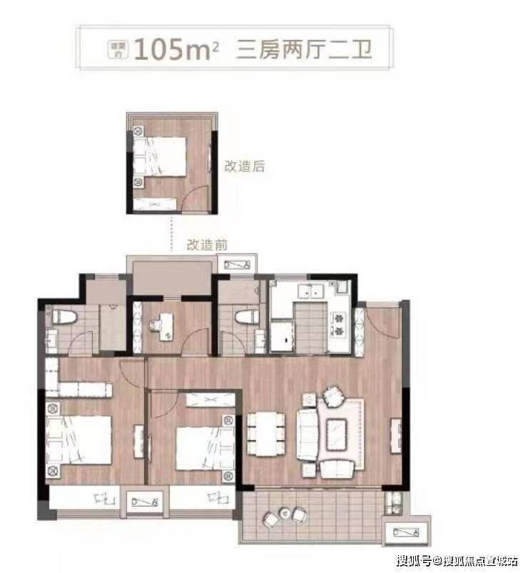 。其中105㎡为小高层产品,采用横厅设计,餐客一体,主卧带套间
