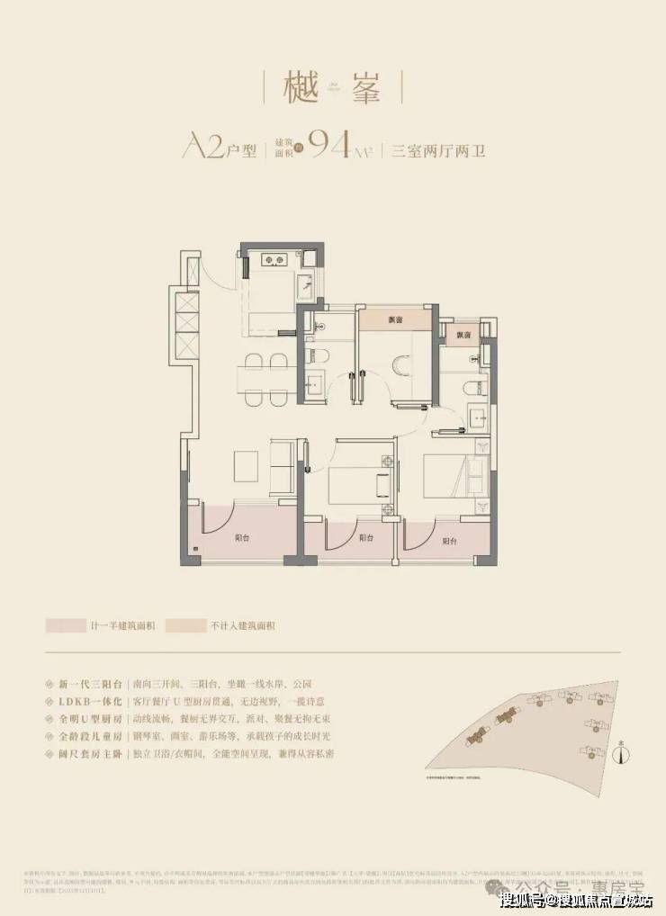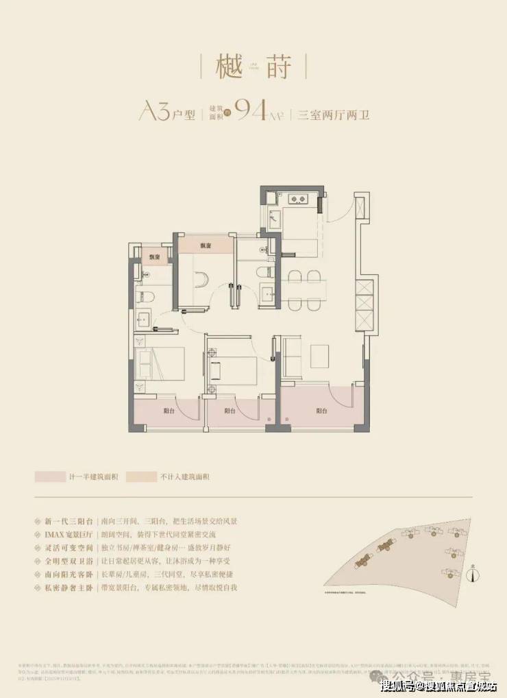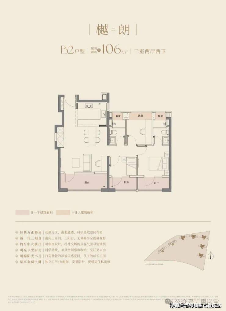 建面约128m3+1房2厅2卫经典动静分离户型,3.5开间朝南+双阳台,阳合仅计算一半建筑面积,主卧以及主卫附赠270°转角飘窗,次卧附赠飘窗且无墙垛!