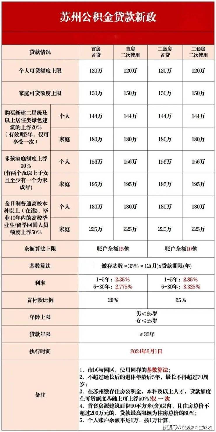 6、公积金贷款额度上限提升,家庭最高可贷150万。2024年6月2日:苏州出台16条楼市政策!公积金贷款个人额度提升至120万!家庭最高额度150万! 目前执行公积金新政如下: