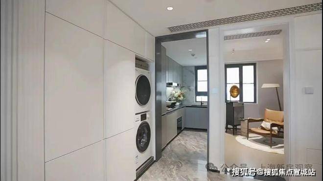 还有一整面墙的收纳, 两台博世嵌入式大冰箱,一台博世洗衣机,一台博世烘干机,上面一整排还打造了储藏空间。