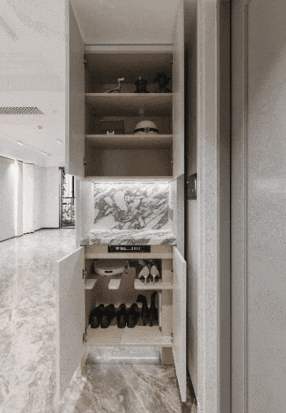 超强的系统收纳: 一进门就做了双面收纳,鞋柜、储物柜、开放格,还考虑到了扫地机器人的空间,细节满满。