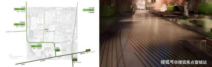 在亭桥街入口,项目铺设水纹地铺,用天然奢石拼贴出抽象水纹,还原了历史上河道交汇的意象;蓬莱路沿街则打造契合原生肌理的城市更新界面,让社区与周边风貌自然融合。