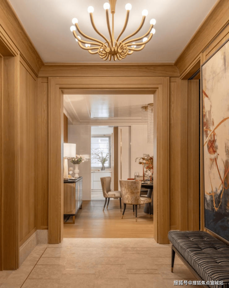 硬装上以木饰面和米色石材做结合,物料原始肌理感,表达经历时间后的沧桑痕迹。大理石地面镶嵌精致金属条,保留材质的原始感,木饰面配柔和灯光,调和出安宁澄澈的归家氛围。