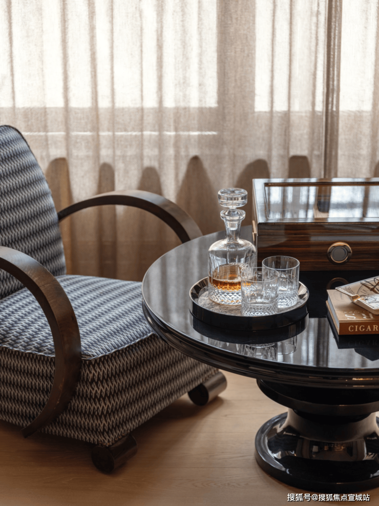 客厅另一端,是连接房内与外景的介质空间,在这里主人和客人可以享受美酒雪茄。看似独立的空间,实际延伸了客厅的功能,也延伸了窗外景观到室内的视线。