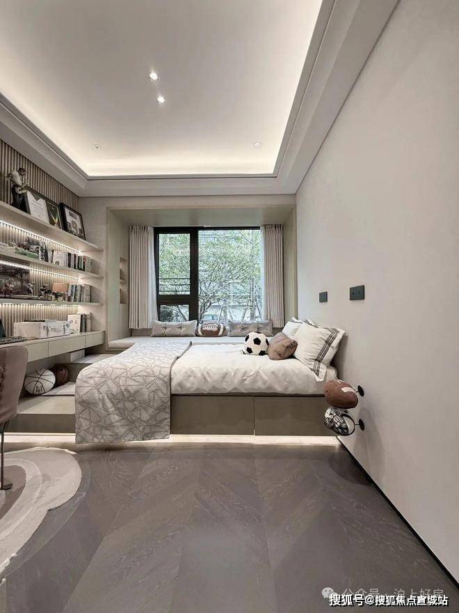 其中主卧的270°转角飘窗就有约5.7m²,通过与外立面的结合,直接做了梳妆台和储物柜,拓展了飘窗的实用性。