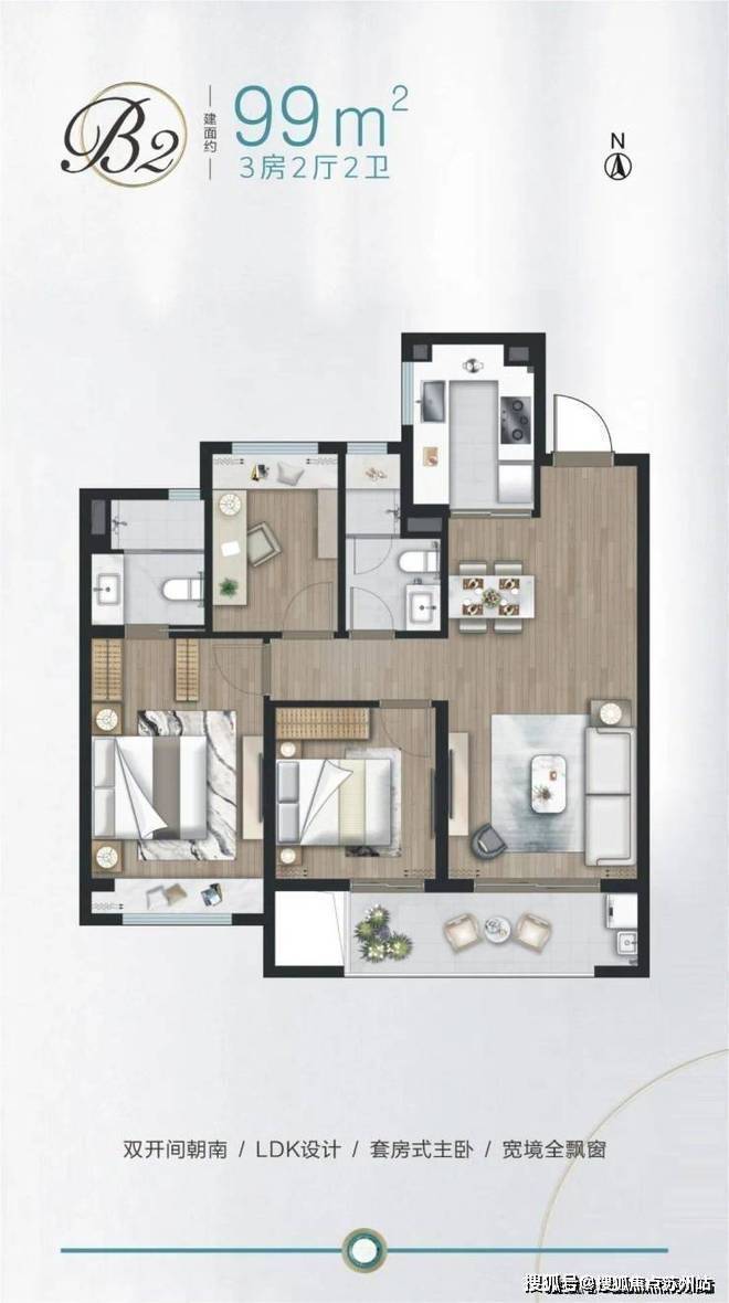 建面约99㎡3房,双开间朝南,双联观景阳台,具有良好的采光、通风。LDK设计,增强互动交流。套房式主卧,步入式衣帽间,兼具舒适性和私密性。