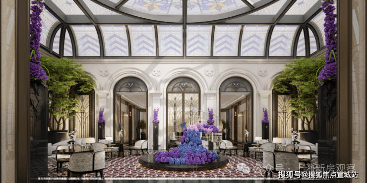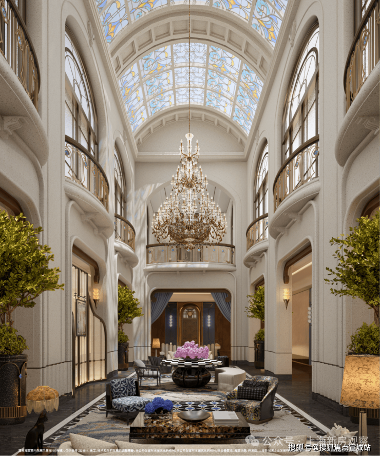 「玉兰门庭」摩登飘逸,环抱式落客前场,大师定制非遗掐丝珐琅门钹,流转温润光华,敬呈归家尊崇礼序,自此启幕生活的华贵序章。
