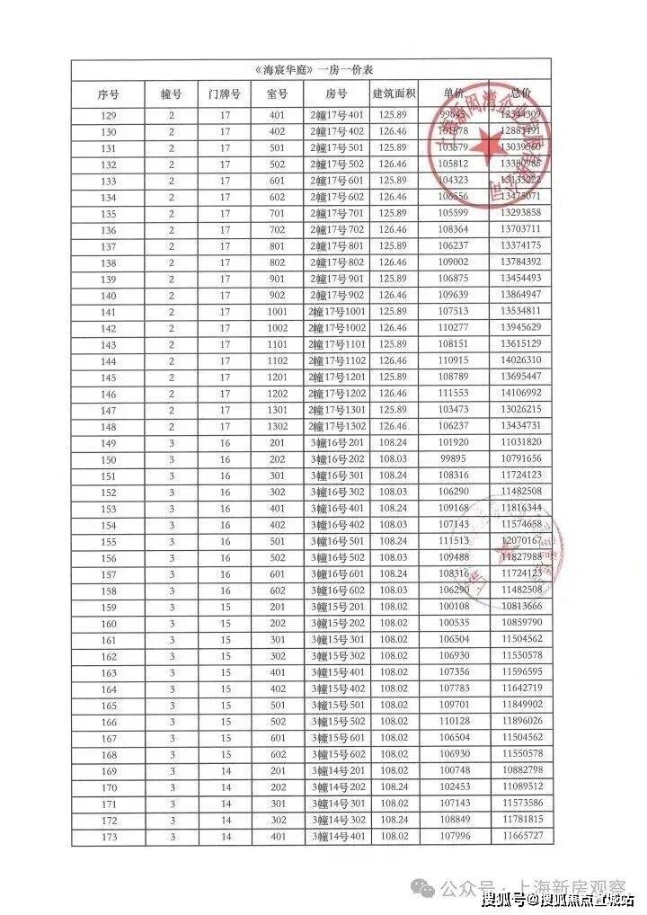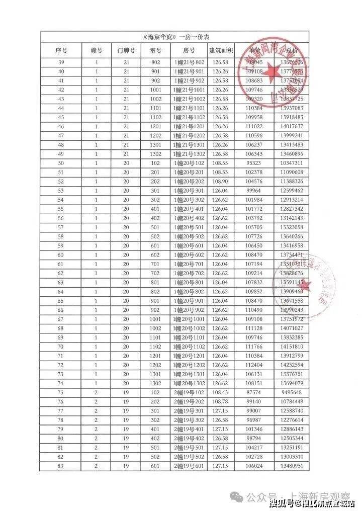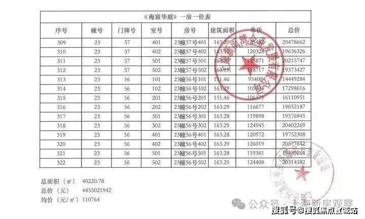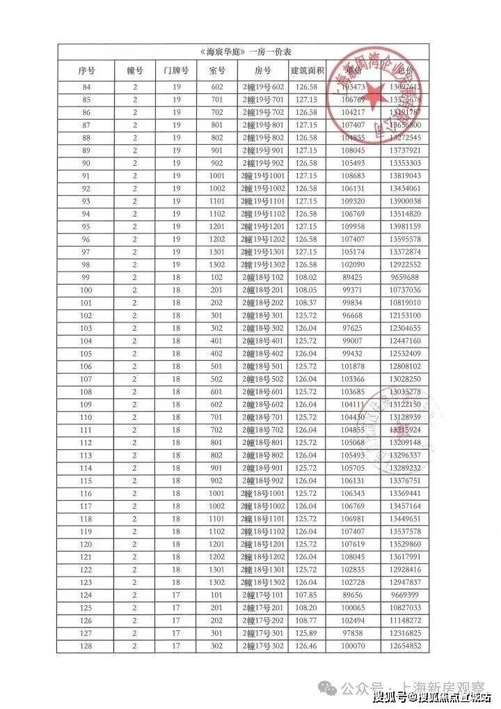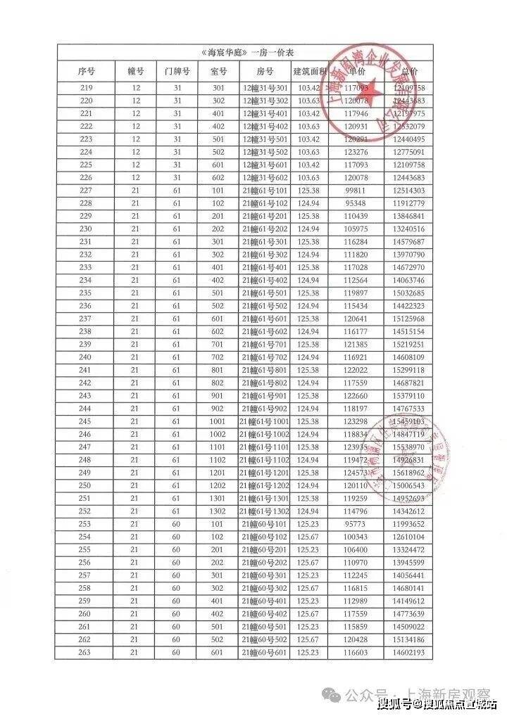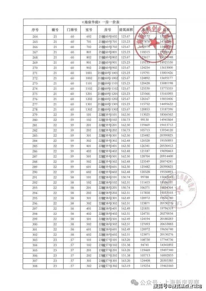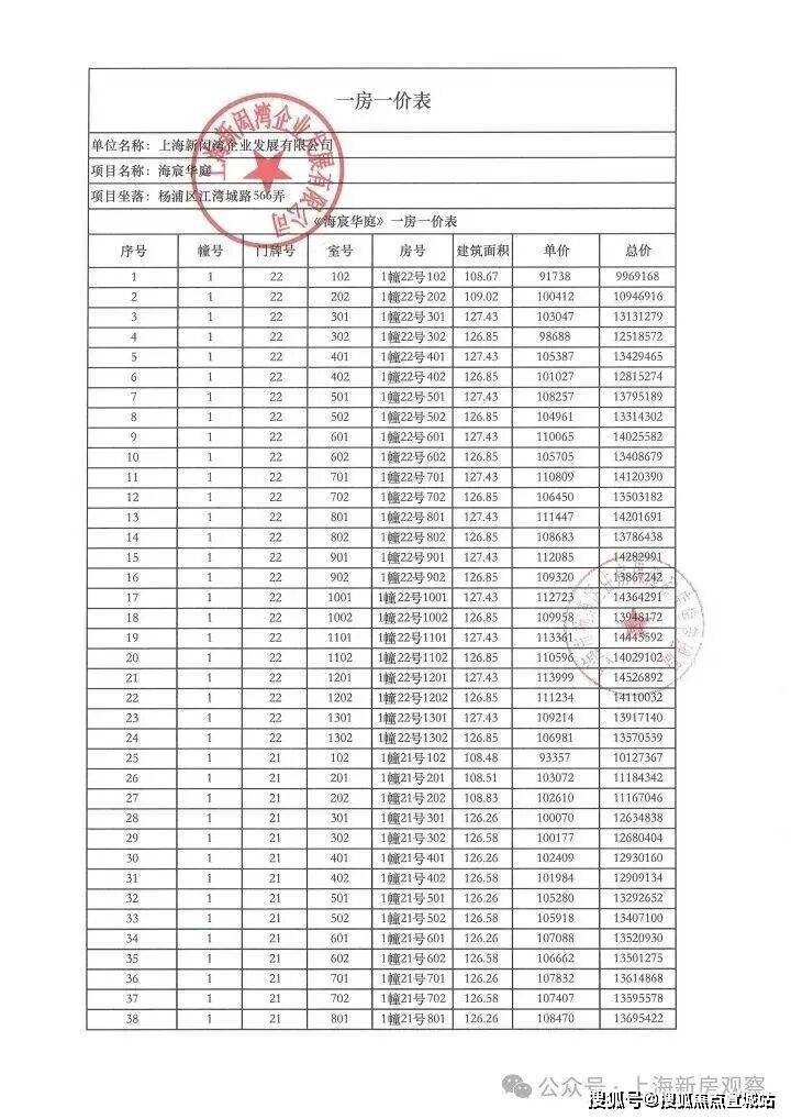 上期一房一价表如下: