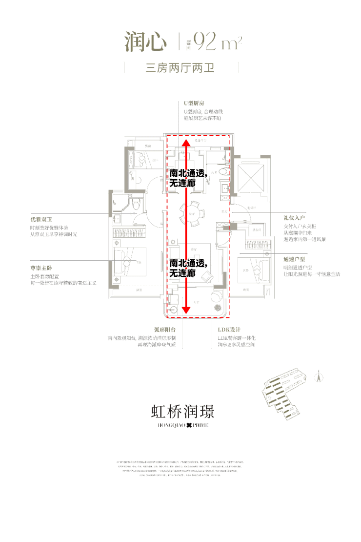 飞机户型设计没有动静分区专属的“室内连廊”,空间利用率高;同时还能做到真正 南北通透,南接 不封闭瞰景阳台(不封算一半建筑面积),厨房北侧 无连廊(采光、隐私更好),再叠加很大的窗墙比,进一步放大室内的 采光、通透性!示意图 实际以交付为准