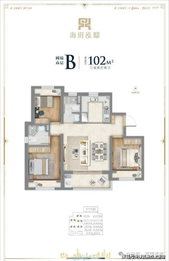 约102㎡的3房2卫户型,大横厅+全卧室带飘窗,这个尺度感相当出色。