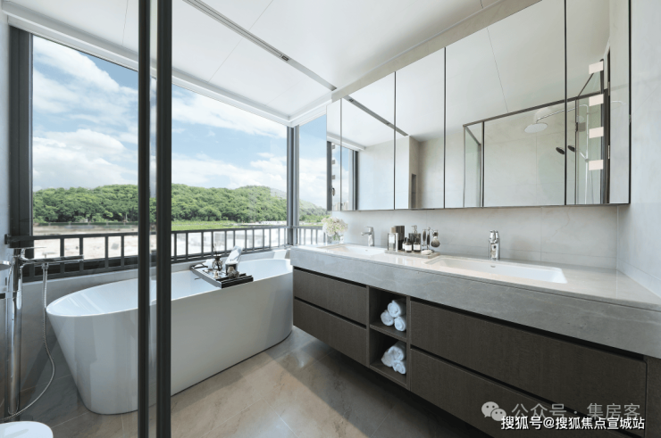 公建化的立面, 四面铝板搭配大面积玻璃,阳台统一封包,底层的浅色天然石材还被打磨出弧线,脱去厚重外壳,轻盈洒脱。项目西侧直线 约800米就是钱塘江,春来晴翠也在园区里编织了一幅山水画卷。