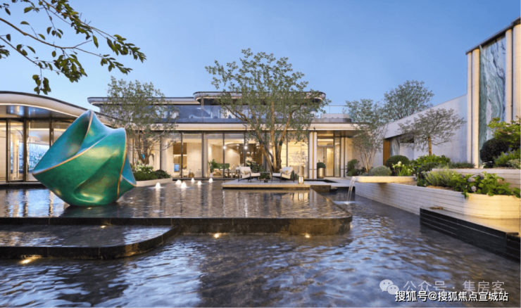 约7米高的主入口,把贝金米黄石材、维多利亚绿等名贵石材,与古铜色金属板、紫薇等名贵草木巧妙搭配、相得益彰,犹如穿着翠绿华服的翩翩公子,透着一身贵气。