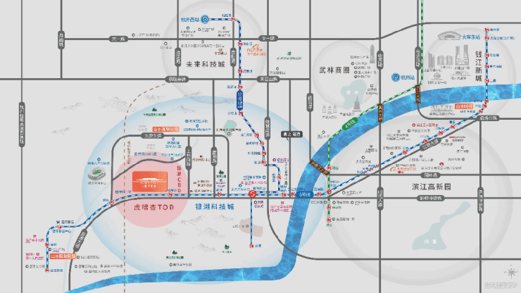 它距离最近的地铁6号线虎啸杏站地铁B口约50米.沿着地铁6号线,3站到之江,8站到滨江,以杭州地铁平均2-3分钟/站来估算,半小时左右就能到达滨江核心区.通过换乘在建的地铁12号线,还可以直通未来科技城.