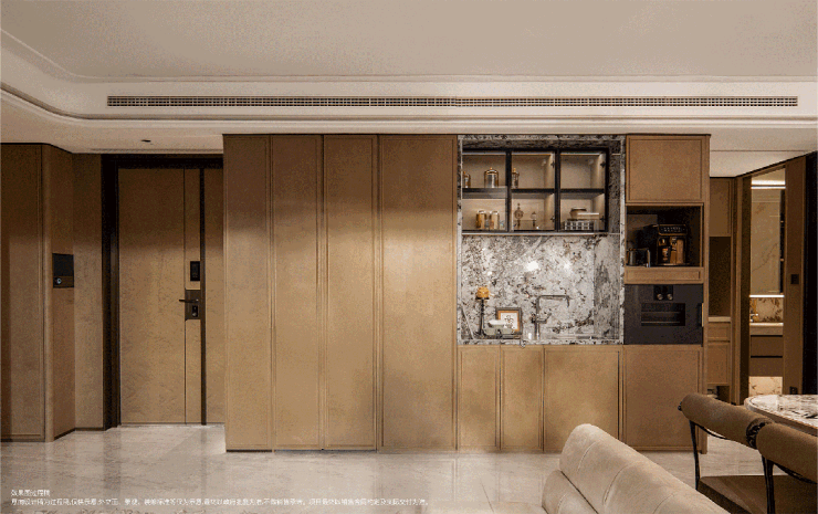 ✔用材考究:室内墙面大量包裹木饰面,温润质感消解冷硬感;137㎡户型地面铺高奢石材,搭配石材打造的弧形餐边柜,厚重质感凸显空间高级感;