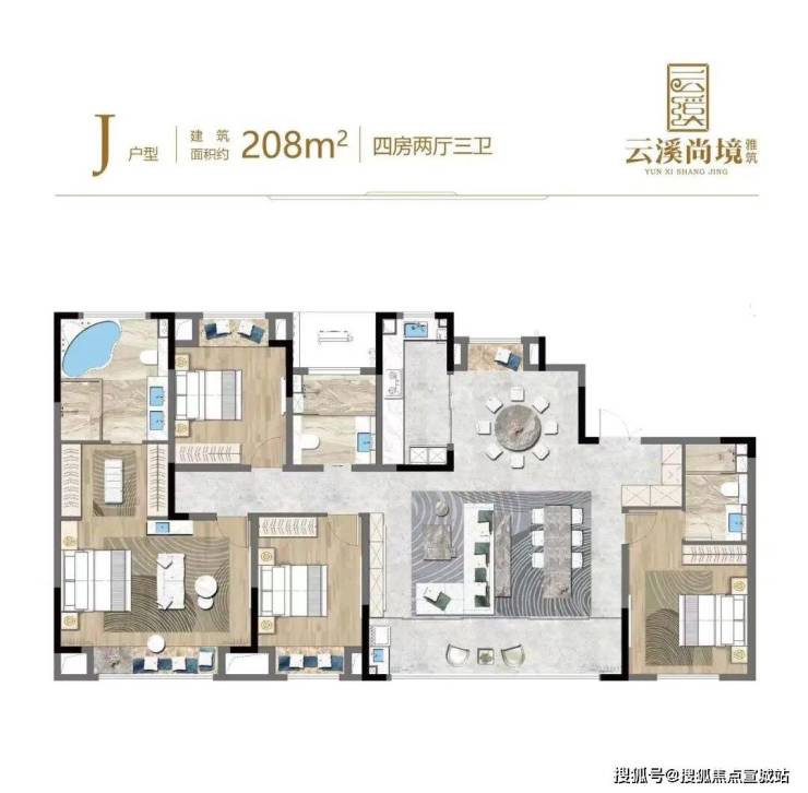 主力户型:有建面约 114㎡的三居,137-146㎡、179-208㎡的四居。