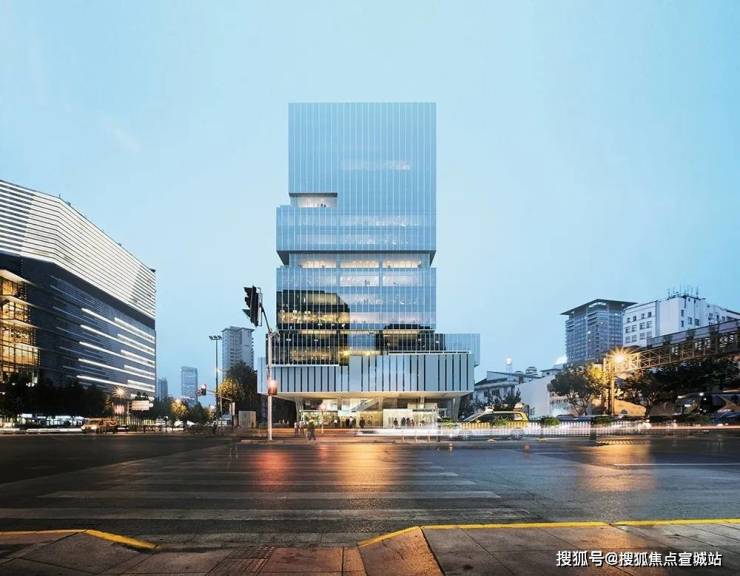 建筑风格:采用新海派风格,外立面由天然石材、真石漆和铝板打造,夜间有泛光照明。