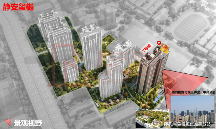 7号楼,位于整个小区的南面头排位置,前排无遮挡,拥有王炸级的城市景观资源: