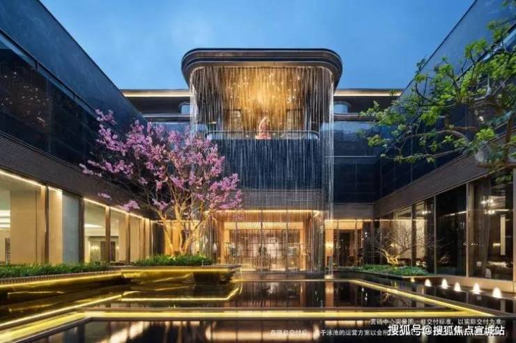 高差约10米的立体悬瀑水景下沉式庭院,同源佛罗伦萨四季酒店的设计手法,师法“琉璃水光”的独特形意,打造糅合视听五感的沉浸式下沉庭院。