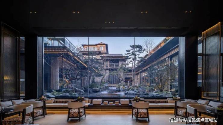 大尺度观景窗借景远山,竖向标高差强化仪式感,庭院中亭子的仰视视角塑造主峰山势巍峨之感。©LEAP绿城利普、筑言建象·建筑摄影