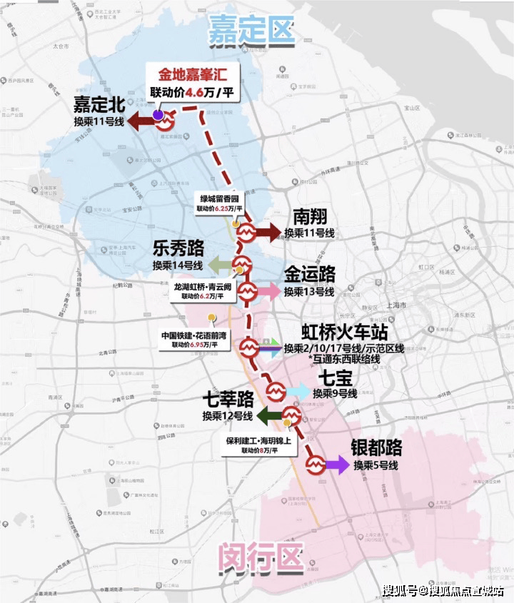 直线距离约200米嘉闵线(在建),8站直达大虹桥,连接七宝、莘庄等多个CBD,不论是上下班、聚会、商务出差等都十分便捷。另外值得一提的是沿线新盘均价均在6-8万区间,其中约350万总价的潜力盘或许只有金地嘉峯汇!