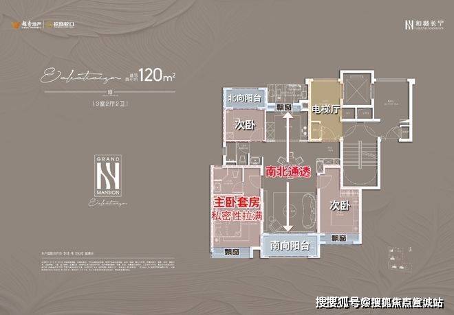 项目建面约120㎡户型也是类独立电梯厅的设计,室内则是标准的南北通透+三开间朝南设计;主卧套房配置,自带卫生间,私密性和舒适度俱佳。