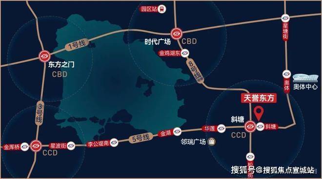双轨交汇黄金四角环湖四轨交汇,缔造金鸡湖黄金四角,西北-东方之门、东北-时代广场、西南-李公堤、东南斜塘老街一黄金四角所在核芯价值所向.