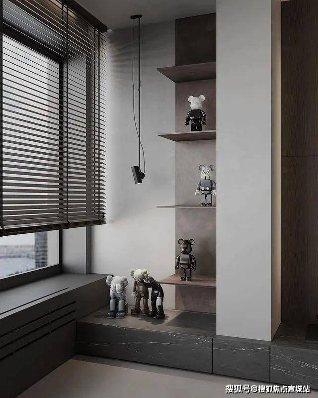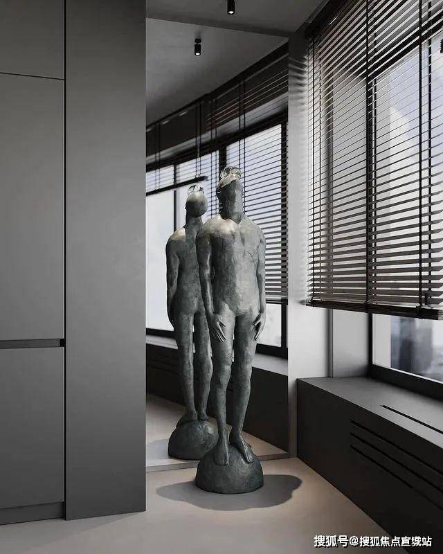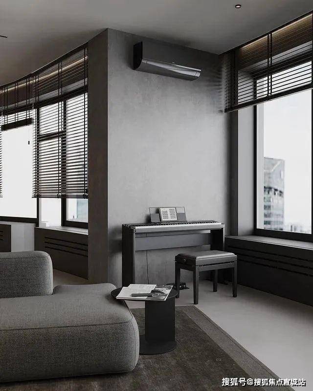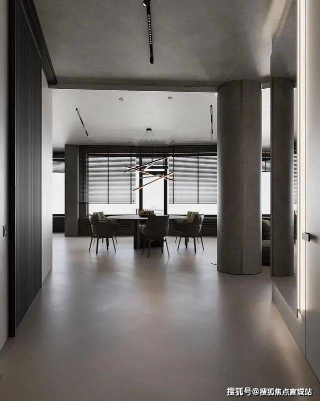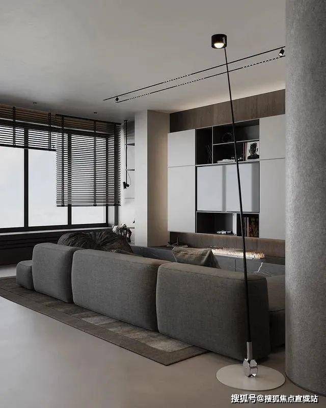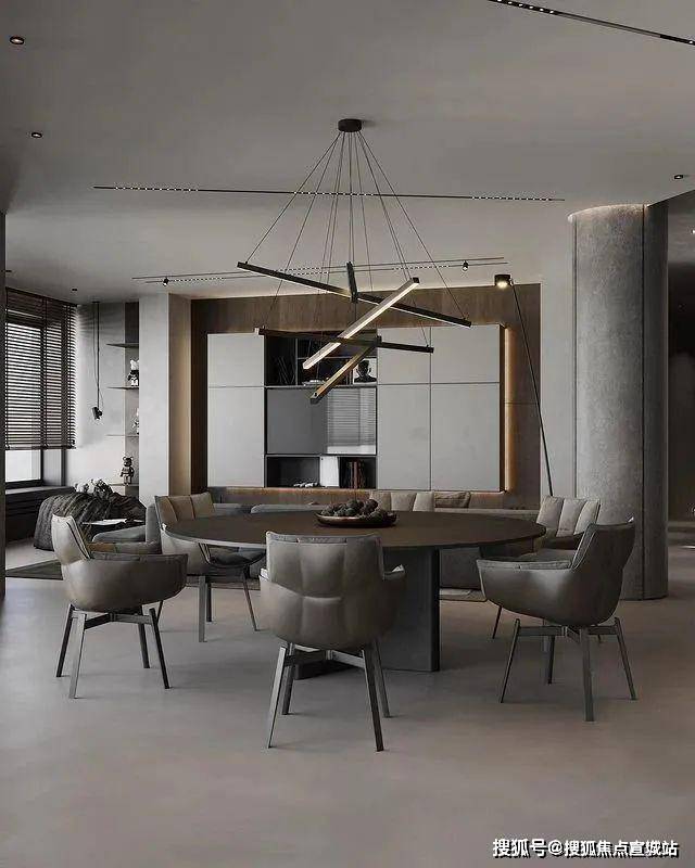 客厅的设计独具匠心,呈半圆形,开口处巧妙地连接了餐厅与厨房。深灰色的主色调在视觉上巧妙地扩展了空间感,使整个空间显得宽敞而舒适。灰色的组合沙发与墙面相呼应,营造出一种简约而优雅的氛围。百叶窗和线性台灯的设计同样充满了现代风格的艺术美学,将整个客厅装点得更加精致和时尚。