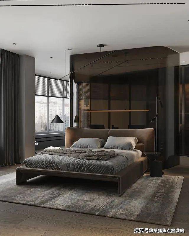 卧室以深色调为主,同时巧妙地将空间划分为卧室区和衣帽间。彩色玻璃隔板将空间巧妙分隔,自然光线穿透其中,营造出更加开阔的视觉效果。整个空间充满了舒适与温馨,让人感受到家的温暖与宁静。