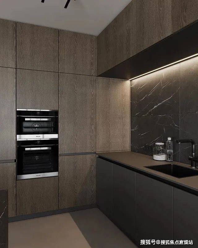 厨房里的定制橱柜将收纳功能发挥到了极致,让人惊叹不已。岛台采用黑色大理石饰面,与深色系的餐椅相得益彰,营造出一种沉稳而高贵的氛围,让人流连忘返。