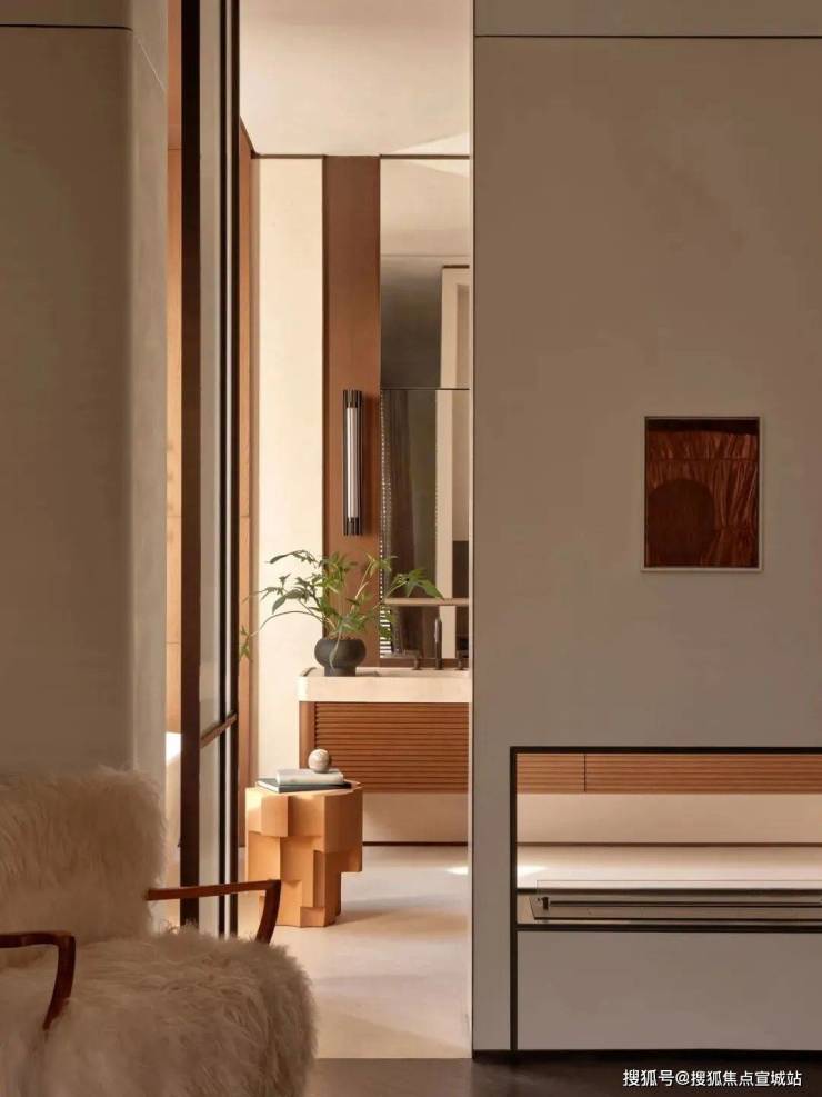 因此,大量选用米灰色石材、砂岩、洞石等自然材料,与棉麻织物、木质家具彼此融合,