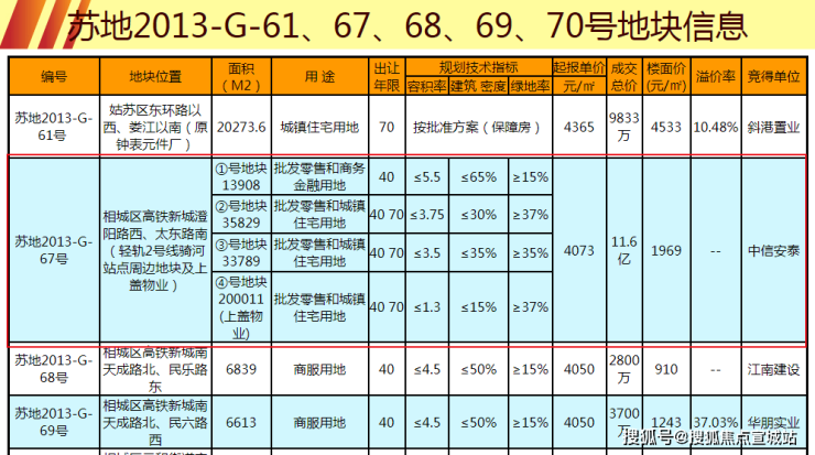 环秀湖花园地块是2013年9月由中信安泰以11亿竞得的苏地2013-G-67号地块,地块成交楼面价仅1969元/平。地块由4个地块组成,1号地块为金融用地,2、3、4号地块主要为住宅。