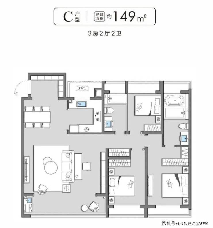 149㎡可能是项目最好的户型,小横厅,3房朝南,但南北不是特别通透。