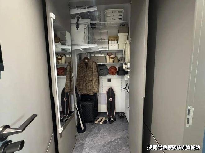 进门后左手边是一个800库,连衣冠镜都有,内部可以按自己需求做隔断,行李箱、球拍、鞋子以及各种杂物尽可往里放.这在百平以内的小户型中并不常见,大多因为空间有限,通常都只打个玄关柜.餐客厅是这个户型的一大亮点,餐厅空间目前放的是4-6人长桌,小编现场估摸着放个一米左右的圆桌是可行的.这个餐边柜的开放格采用了鱼肚灰石材装饰也是交付标准之一.厨房部分巧妙的利用了飘窗台做水槽的设计,提升了厨房实际使用空间,实际上很多120㎡户型的厨房空间和国誉府这个98㎡的相比也就差不多大.