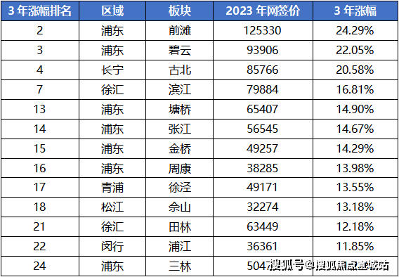 上海一共121个板块,有近四分之一板块的二手价格,3年时间,涨幅超过10%;其中又有13个板块,因为连涨,特别值得关注。