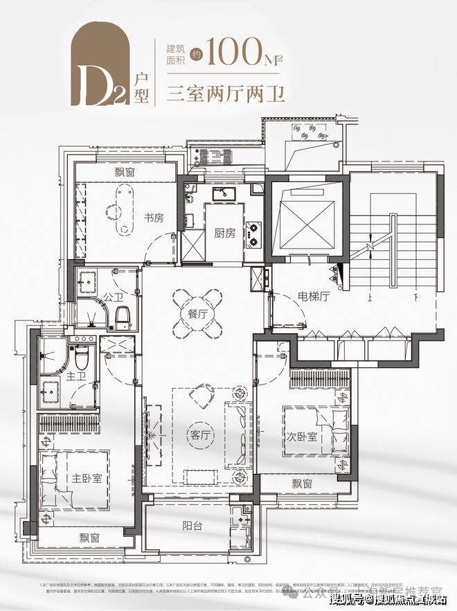 另一套建面约100㎡飞机户型,同样做了三房两卫,户型方正,几乎无过道设计,每一寸空间都没有浪费,舒适不局促。