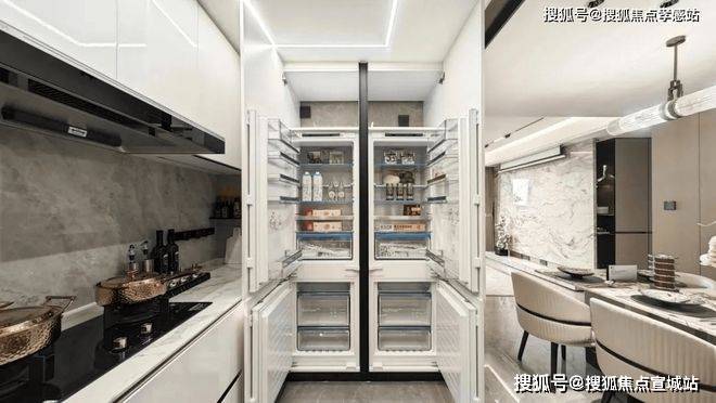厨房空间,精选了西门子新款的抽油烟机、灶具、洗碗机等,甚至包括通常项目不提供的冰箱;还特别配置了轨道插座、前端净水器和凉霸;吊轨金属玻璃移门,既美观又便于清洁。