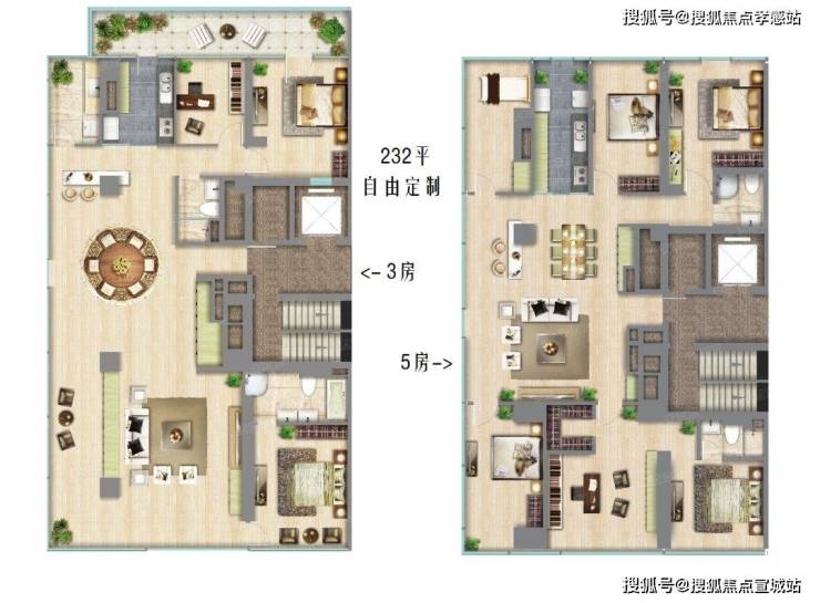 以232㎡面积产品为例,既可以做成3房也可以做成5房,全看用户灵活定制要求。追求简约艺术风格的话,你要做成大平层2房甚至1房也可以,留下空间来室内滑板或开卡丁车!