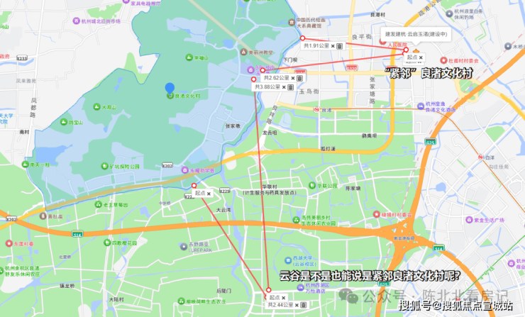 怎么说呢,这个距离能说“紧邻”的话,那直线距离良渚文化村约2.4公里的云谷,也能说自己是“紧邻”良渚文化村了。