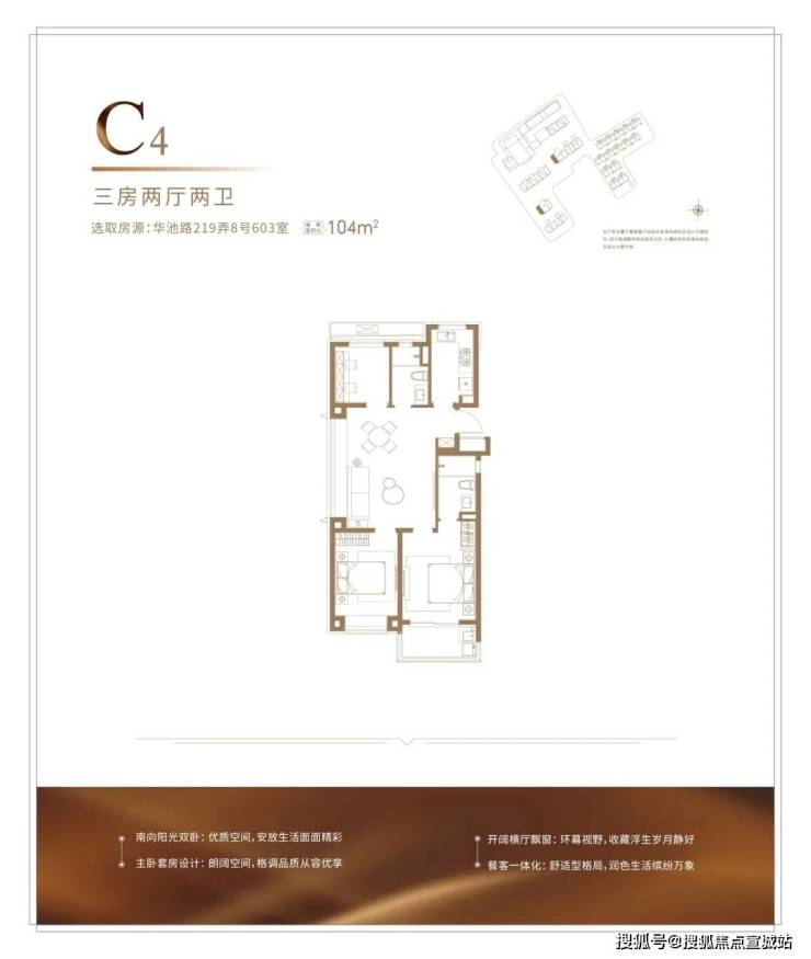 建面约104㎡的户型,能满足从二人世界到二胎生活的全生命周期需求,并且整体2-3开间朝南+客厅宽面阳台,整体的南向采光,视野以及尺度感很优秀,并不会感觉局促。