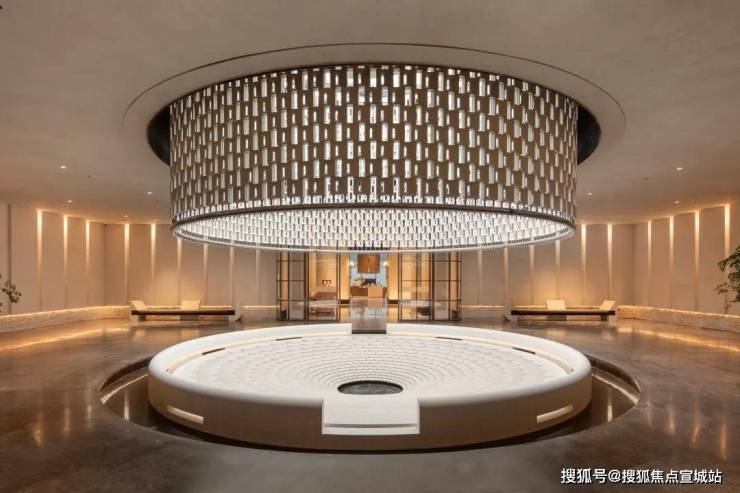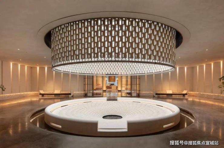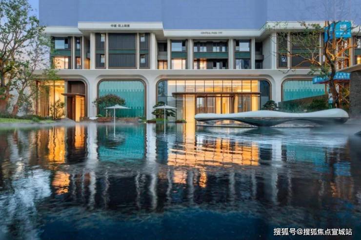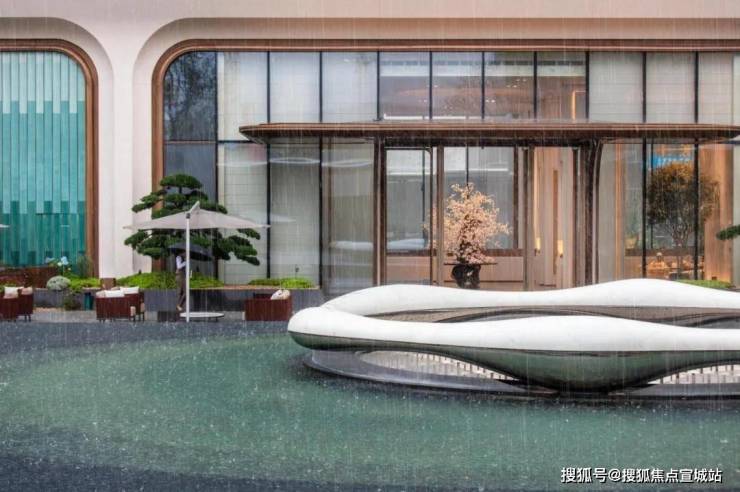 浮光池院水院会客厅,现已实景呈现,水景中央的艺术小品,如一滴水在湖面晕开,泛起阵阵涟漪。