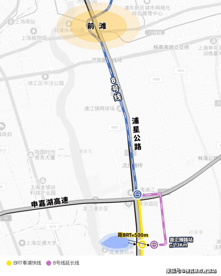 项目距离浦江线汇臻路站约1.3KM,5站即达沈杜公路站并与8号线换乘,可一线直达前滩。或通过BRT快线可一站无缝对接8号线沈杜公路!