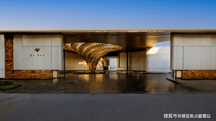 在门庭外,辅以两侧具有仪式感的跳泉水景,将建筑的圆弧美感与自然水景相合,共同构成海上·清和玺“贵雅清和”的城市界面。