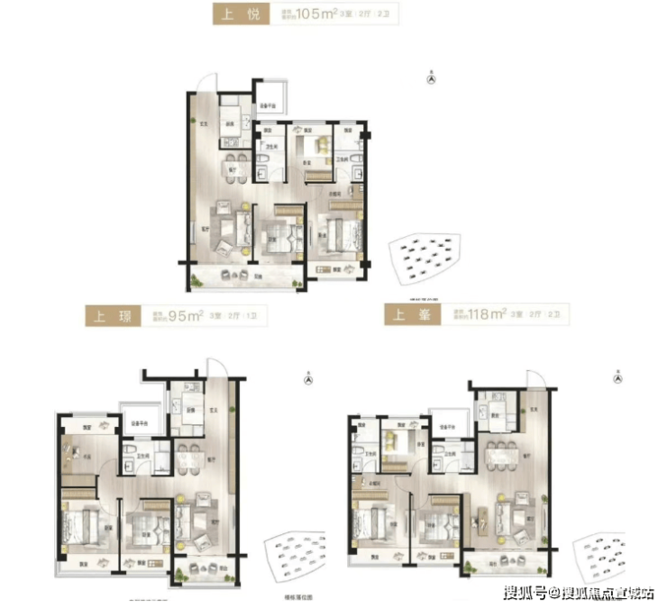 面积与布局:主要有 95㎡、105㎡、118㎡三种户型,均为三居室设计,户型方正,南北通透,多飘窗设计,采光充足。