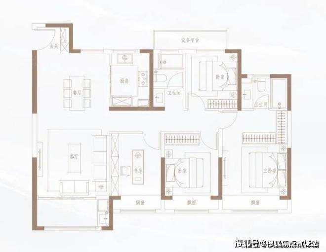 138㎡户型开间阔绰,4室2厅2卫,三房朝南,均赠送飘窗。
