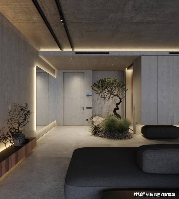 天花板以裸露的方式呈现,给室内增添了几分朴实的工业化美学。大面积的落地窗造就了室内良好的光线环境,让整体灰色系的空间看起来并不那个阴暗。