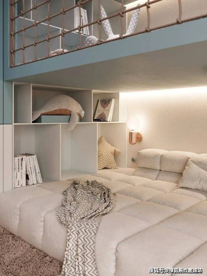 儿童区域则增添了更多的色彩,备显轻松、活力,浅蓝色让人如临海洋,黄色积极活泼有张力,而米色作为主颜色打底,遍布整体空间,来给予温馨、居家的氛围感。